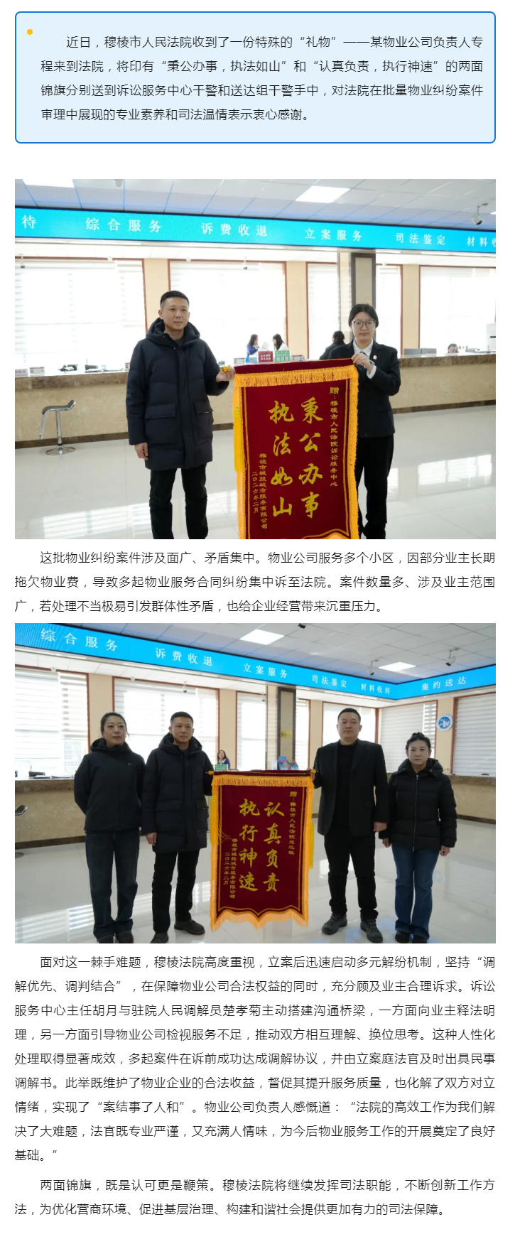 两面锦旗背后的故事——穆棱法院倾力化解物业纠纷,助力构建和谐社区